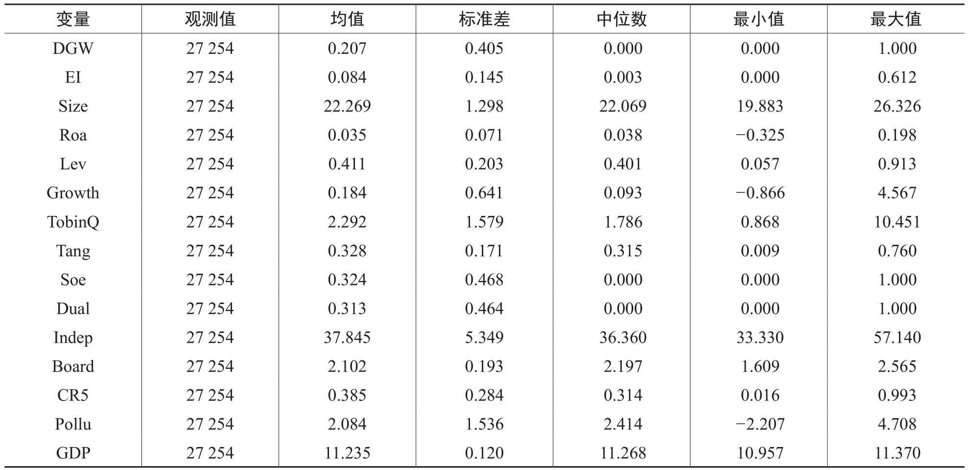 参考黄溶冰等(2020)、王暖欣和张双鹏(2024)的做法,分别从企业财务特征、公司治理特征、外部环境特征等层面,控制可能影响企业“漂绿”行为的因素,包括企业规模(Size)、总资产报酬率(Roa)、资产负债率(Lev)、营业收入增长率(Growth)、托宾Q值(TobinQ)、有形资产占比(Tang)、产权性质(Soe)、两职合一(Dual)、独立董事比例(Indep)、董事会规模(Board)、股权制衡度(CR5)、地区污染水平(Pollu)、地区人均GDP(GDP)。同时,控制年度固定效应和行业固定效应。