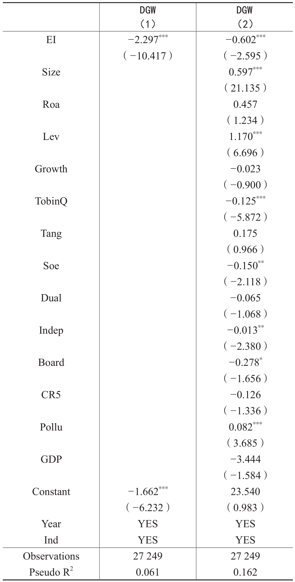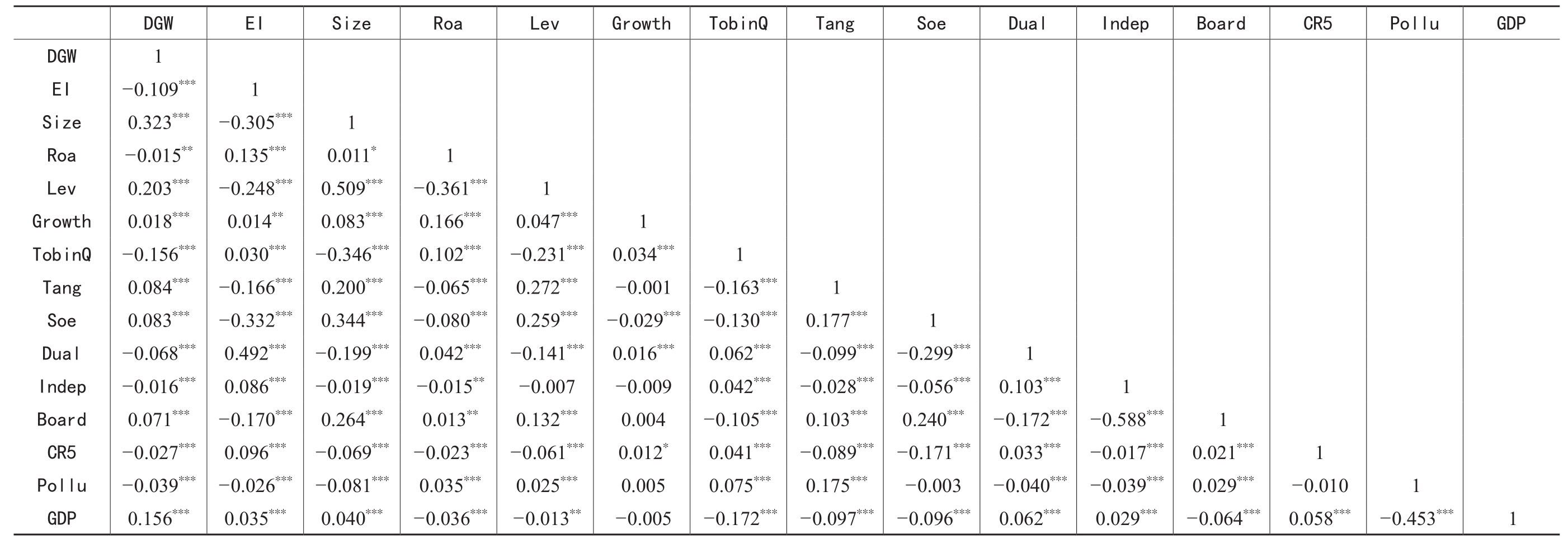 表2列示了主要变量的描述性统计结果。由表2可知,企业“漂绿”行为(DGW)的均值为0.207,标准差为0.405,表明存在“漂绿”行为的企业约占样本企业的20.7%。高管股权激励(EI)均值为0.084,标准差为0.145,表明公司间的股权激励强度存在较大差异。企业财务特征层面,企业规模(Size)、总资产报酬率(Roa)、资产负债率(Lev)、托宾Q值(TobinQ)的标准差分别为1.298、0.071、0.203、1.579,表明样本公司在企业规模、盈利能力、财务杠杆以及市场价值等方面存在较大差异。公司治理特征层面,产权性质(Soe)、两职合一(Dual)的均值分别为0.324和0.313,说明国有企业、董事会兼任总经理企业分别约占样本企业的32.4%和31.3%。外部环境特征层面,地区污染水平(Pollu)标准差为1.536,均值为2.084,说明不同地区污染排放程度具有较大差异。