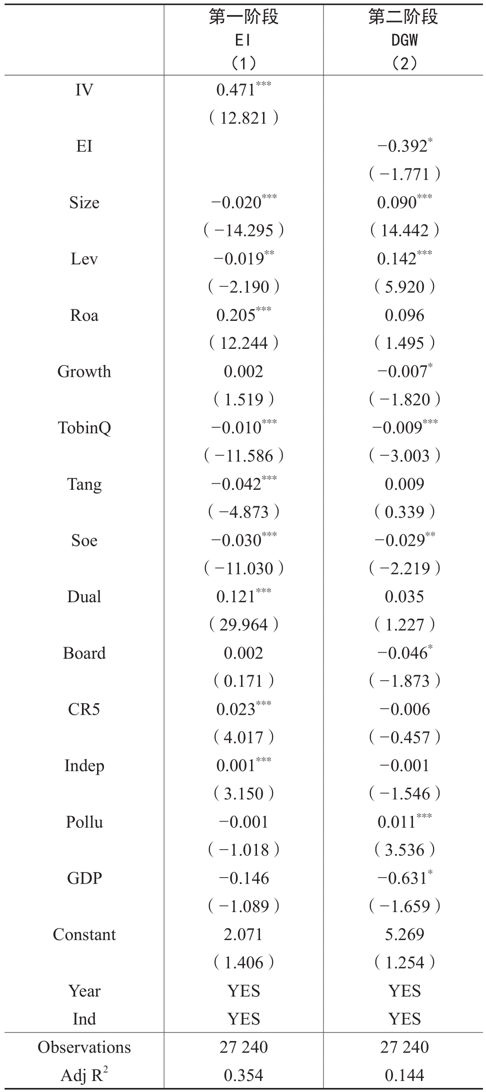 表4列示了高管股权激励对企业“漂绿”行为的回归结果。由第(1)列可知,在不放入控制变量且仅控制企业的个体与年份固定效应情况下,高管股权激励的系数为负,且在1%水平上显著;由第(2)列可知,加入控制变量后,高管股权激励(EI)与企业“漂绿”行为(DGW)的回归系数依然为负,并在1%水平上显著,表明实施高管股权激励能够显著抑制企业“漂绿”行为,本文的假设1得到验证。