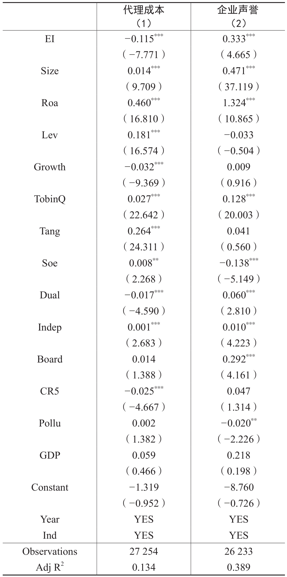 表3是对本文主要变量的相关性分析。可以看出,高管股权激励(EI)与企业“漂绿”行为(DGW)的Pearson相关系数在1%水平上显著为负,表明高管股权激励能够抑制企业“漂绿”行为,本文的假设1得到初步验证。同时,表3中其余各变量的相关系数绝大多数小于0.5,表明各变量之间没有明显的多重共线性问题,所选变量可用于进行回归分析。