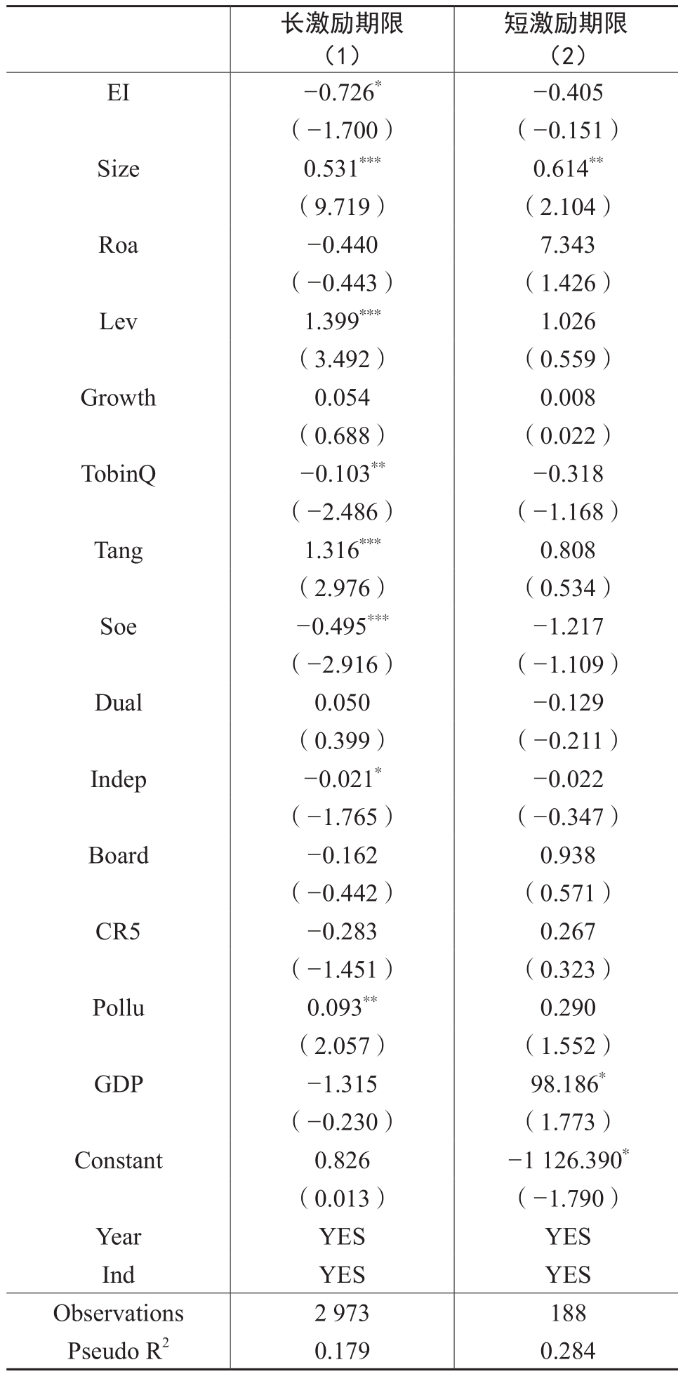 既有研究认为,股权激励有激励型股权激励与福利型股权激励之分(吕长江等,2009)。一般来说,激励型股权激励具有较长的期限。一方面,激励对象无法在短期内获得全部收益,从而有效避免追求短期利益的短视行为;另一方面,激励对象需要在较长时期内保持良好表现,促使其持续有效地执行企业战略。激励对象面临更为严格的激励约束,促使其更加关注长远发展(黄新建等,2020)。相比之下,福利型股权激励期限较短,这不仅容易滋生短视行为,而且可能成为高管进行利益输送的工具,最终损害公司长期利益(王斌等,2022)。由此,本文合理推测,激励期限对股权激励的实施效果具有正向影响,即在股权激励期限相对较长的公司中,高管更注重公司价值的持续增长,从而对真实环保行为的态度愈发积极,最大限度地抑制“漂绿”行为。为此,本文以股权激励期限作为关键变量,将激励期限高于样本中位数的公司划分在长激励期限组(激励型股权激励),低于样本中位数的公司划分为短激励期限组(福利型股权激励)。结果如表9所示,高管股权激励与企业“漂绿”行为的回归系数在长激励期限组中显著为负,在短激励期限组中不显著,表明当公司构建了较长期限的股权激励机制时,高管更倾向于采取积极的环保措施,从而抑制企业“漂绿”行为,前文预期得到验证。