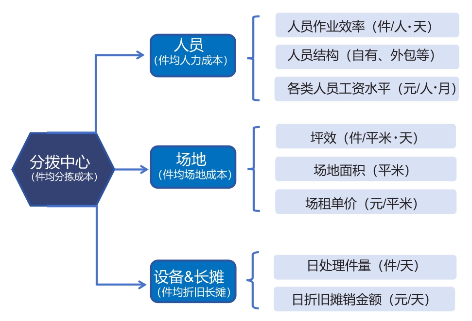 以分拨中心业务为例(见图2):分拨中心运营管理的财务表现可以用件均分拣成本来总括反映。在分拨中心进行包裹分拣操作需要耗用的资源为人员、场地、设备,分别以件均人力成本、件均场地成本、件均折旧摊销成本来衡量。而上述各项资源耗用成本的高低由资源使用效率、资源要素结构、资源采购单价等业务指标决定,如件均人力成本由人员作业效率、人员结构、分类型人员工资水平等因素决定。因此,相关业务团队通过制定策略提升资源使用效率、优化资源要素结构、压降资源采购单价就能提升该环节的财务表现。