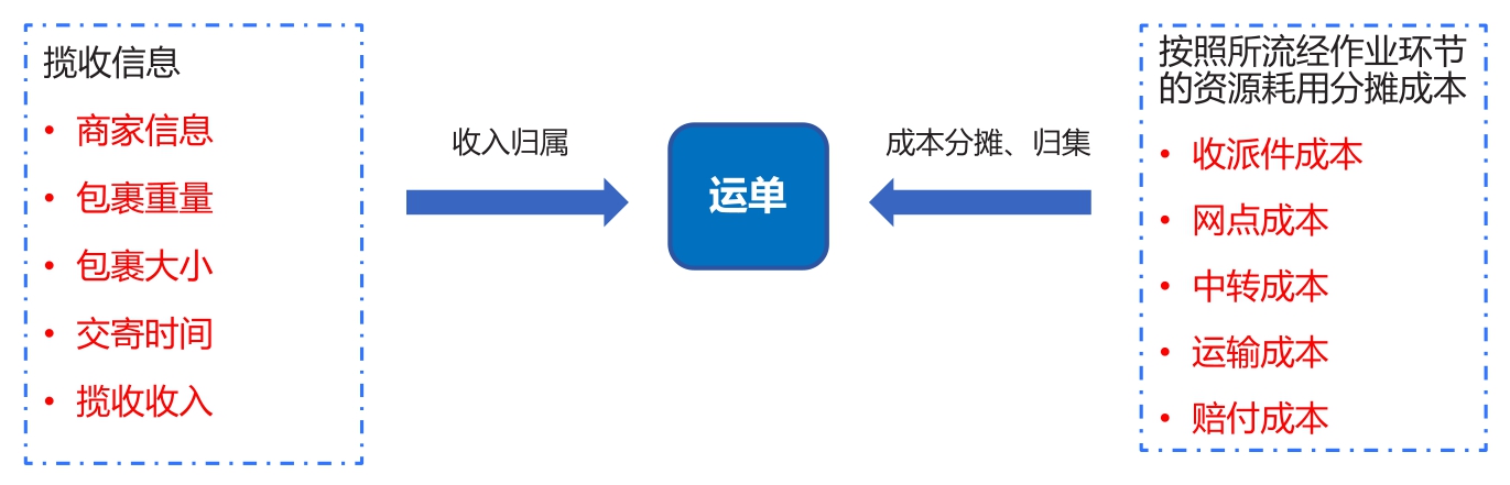 多维精益管理平台需对接各业务系统、财务系统,以每一个运单号为载体,记录所交寄包裹的客户信息、揽收收入、物理信息(重量、大小等)、作业信息(揽收时间、揽收人员、运输车次、分拣节点、派送方式等)、耗费资源(揽收提成、运输资源价格、派费等)等数据(见图3),并按照作业成本法归集、分摊每一个包裹取得的收入、耗用的各环节成本。
