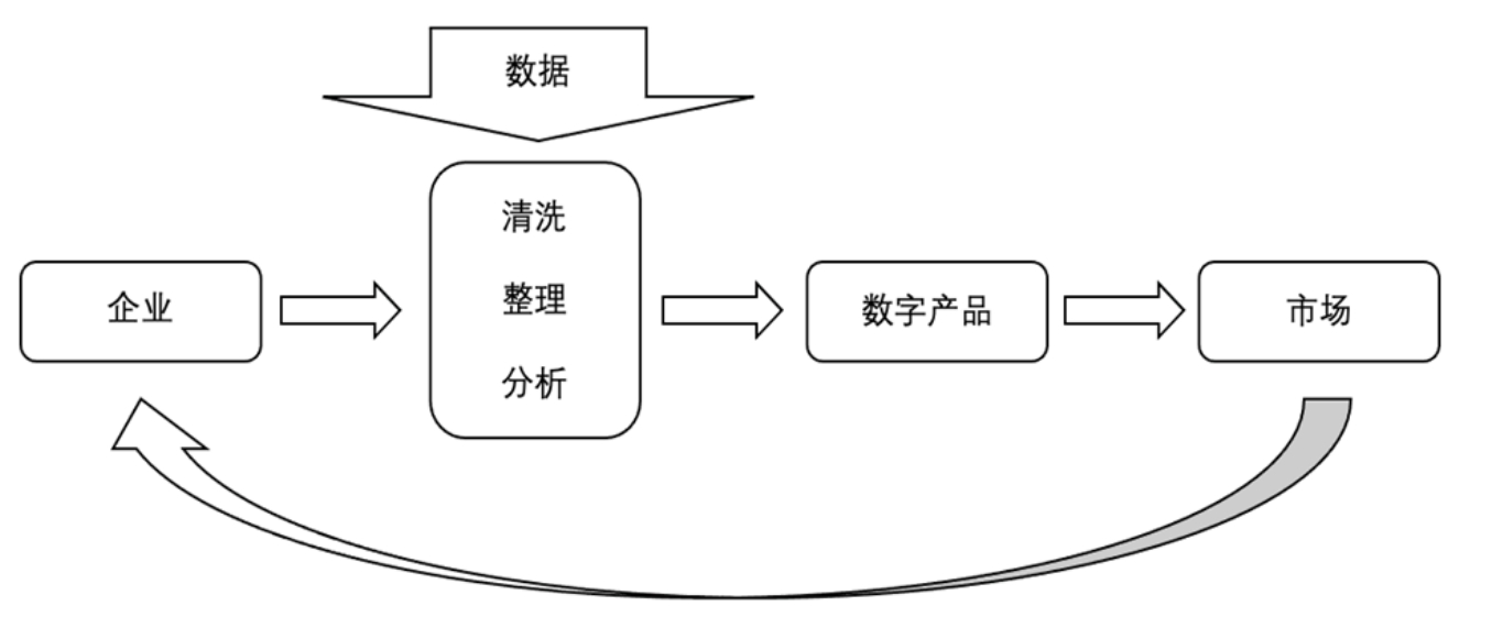 数字产业化是指在互联网、大数据、人工智能等技术推动下实现数字技术动态创新和数字商业创新的过程(唐要家和唐春晖,2023),是数字技术推动涌现出的经济新形态(李腾等,2021)。在数字技术创新和数字商业创新驱动下,相关企业通过对数据的采集获取、存储加工、分析挖掘等,最终实现驱动商业、实现价值。数字产业化的主体从信息通信产业逐渐拓展至数字内容、数字交易等,其核心在于依靠信息技术创新推动数字产业繁荣发展。图2列示了数字产业化的实施过程,即企业在现有数据处理的基础上形成数字产品,并成为企业的主要业务模式(李永红和黄瑞,2019)。