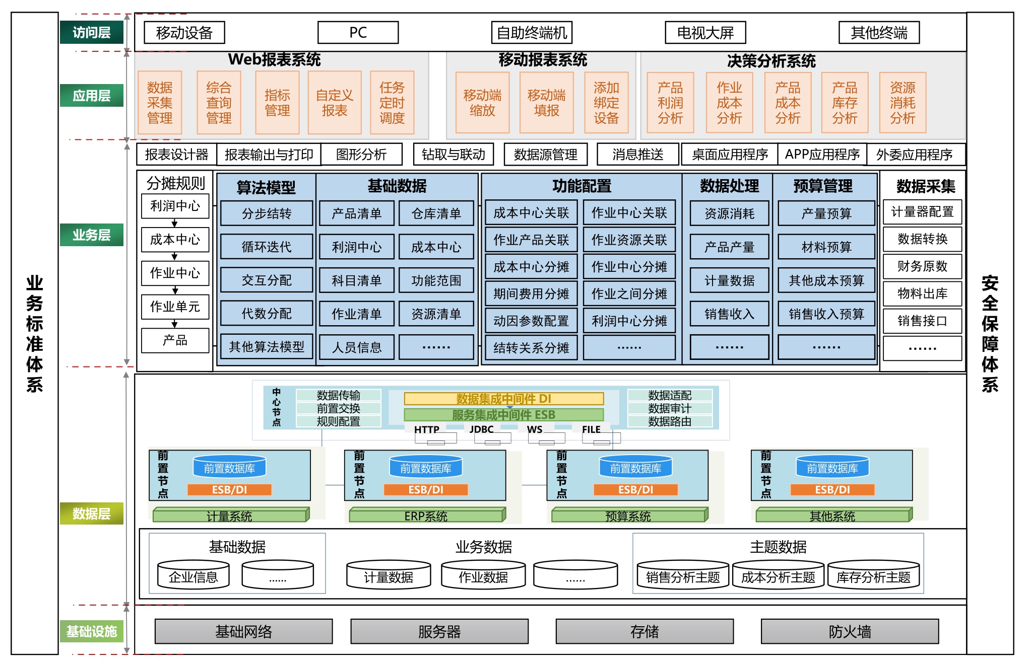 一是保障层主要包含业务标准体系和安全保障体系,保证了作业成本管理信息系统贴合业务实际,符合安全管理要求,满足操作的可行性与有效性。二是基础设施层主要包含基础网络、服务器、操作系统、存储、防火墙等基础设施安装部署,为系统设备运营管理和数据信息安全提供基础环境。三是数据层主要含数据交换和数据集群,具有承上启下的关键作用。数据层集成多源异构数据,运用微服务框架下的数据交换系统提供的数据处理服务,将交换至暂存区的数据进行统一的合并、过滤、比对、编目以及主题加工等操作,将不同格式、类型、结构的数据进行标准化处理,统一存储在共享数据中心,为后续成本核算与分析提供了标准化数据基础。四是业务层通过可视化、组件化、拖拽式、全业务建模,搭建算法模型、基础数据管理、业务功能配置、数据处理、预算管理、数据采集、报表分析及数据展板等功能点。五是应用层主要包含Web报表、移动报表、决策分析,提供丰富的数据分析工具和报表模板,支持用户进行自定义分析,通过可视化手段展示数据分析结果,帮助用户更直观地理解成本结构和变化趋势。六是访问层提供移动端、PC段、自主终端、电视大屏、其他终端额访问。