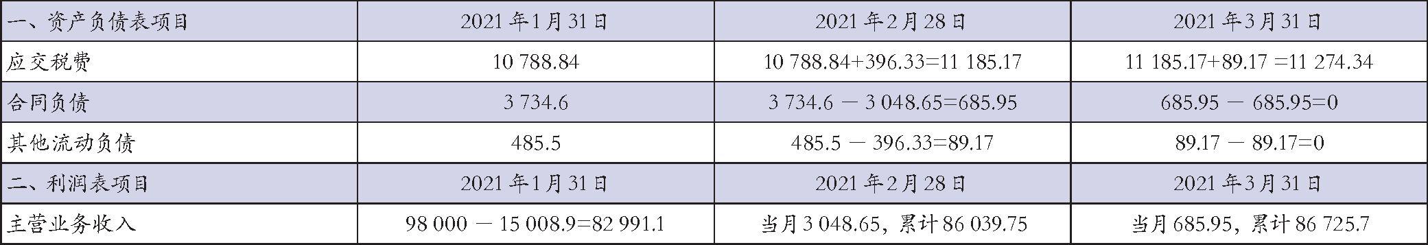 通过以上例 3、例 4、例 5的账务处理,将 2021年 1〜3月份业务进行累计:主营业务收入= 98000-15008.94+3048.65+685.95=86725.66(元);增值税销项税额= 10788.84+396.33 +89.17=11274.3(4元);价税合计= 86725.66+11274.34=98 000(元)。