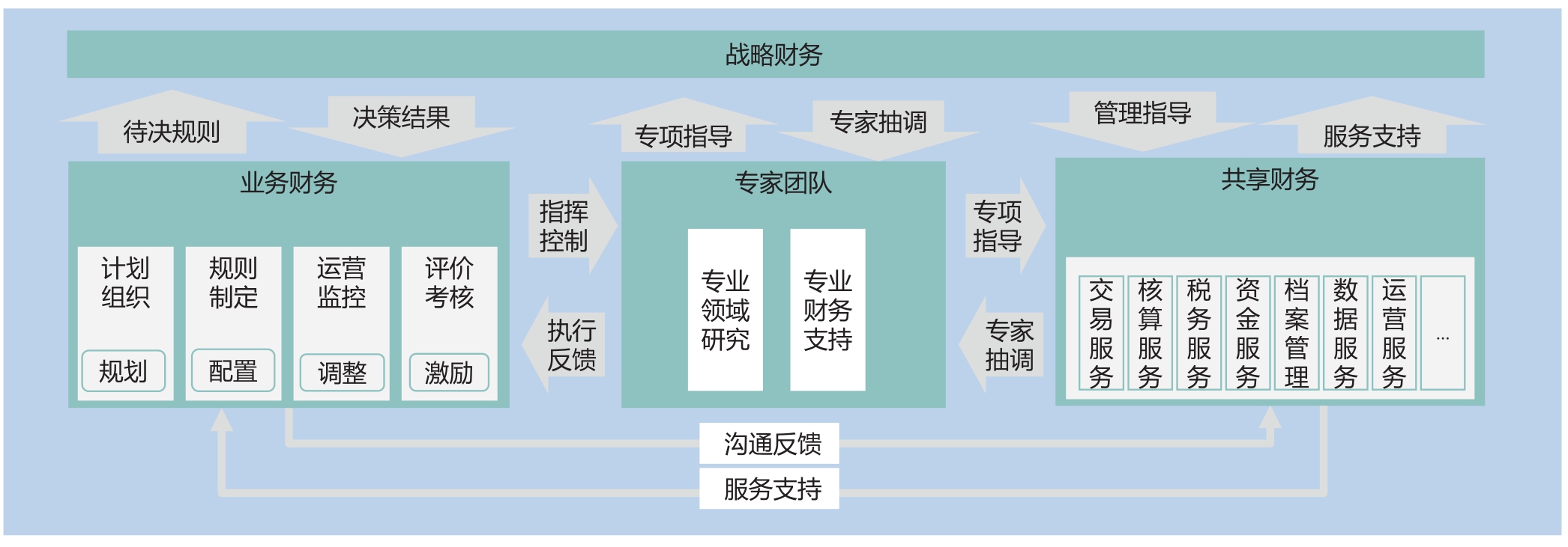 组织重构后,集团总部作为战略财务,通过制定财务政策,建立全面预算、成本管理等财务运行核心体系,将会计信息转化为对公司决策有价值的经营信息,支撑战略决策,财务职能更“精深”;各业务单位作为业务财务,分析业务单位的财务支持需求,将共享服务数据转变为有价值的财务信息,执行总部管控要求,推动集团战略落地,财务职能更“宽广”;共享中心作为共享财务,向各级企业提供会计核算、财务报告、绩效报表、税务管理、标准化数据加工等服务,发挥数据支持作用,财务职能更“专业”;专家团队作为灵活的工作组织,以项目化运作方式从财务人才队伍中选拔相关领域专家组成专业化项目团队,提供专业研究及指导支持。