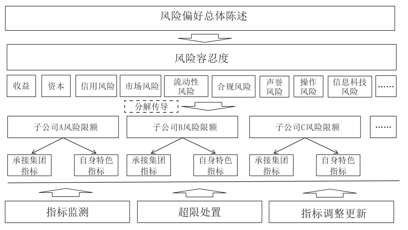 风险偏好是金融控股集团风险管理战略的核心体现。风险偏好管理的整体工作既是风险战略分解及落地执行的直接反映,也是集团层面战略风险管理的重要组成部分。风险偏好管理运行机制如图2所示。