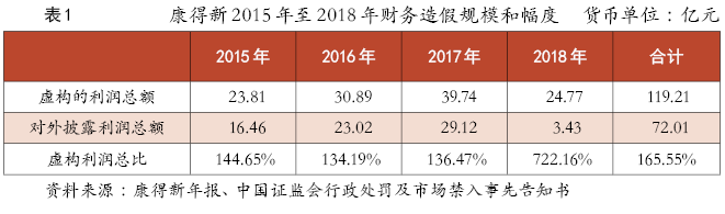 康得新账上122亿元银行存款被北京银行告知余额属实但可用资金为零,至今还在为这笔巨额存款存在与否及其归属与北京银行争论不休。更为恶劣的是,康得新在2015年至2018年期间,通过子虚乌有的业务,凭空虚增了119.21亿元利润总额,占其对外披露利润总额的165.55 %(如表1所示)。