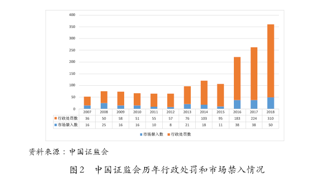 图2列示了2006年至2018年中国证监会的行政处罚决定和市场禁入情况。