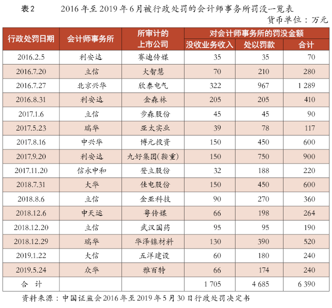 我国对财务造假的处罚规定失当,不仅体现在对上市公司的经济处罚力度太小,还体现在以下三个方面:一是刑事责任追究不力,以罚代刑的现象十分突出;二是处罚主体错位,将上市公司而不是实际控制人作为处罚主体,造成本来就因财务造假遭受重大损失的中小股东受到二次伤害;三是主次颠倒,对会计师事务所的经济处罚重于上市公司(如表2所示)。从表2可以看出,中国证监会在这16起行政处罚决定中,除了没收会计师事务所1 705万元的业务收入外,还处以4 685万元的罚款,是对这16家上市公司罚款960万元的4.88倍。这些会计师事务所被处罚,主要是因为审计执业存在疏漏之处,并非与上市公司串通舞弊,退一步说,即使是串通舞弊,充其量也只是从犯,而不是主犯。对从犯的处罚重于主犯,这样的逻辑真是匪夷所思。