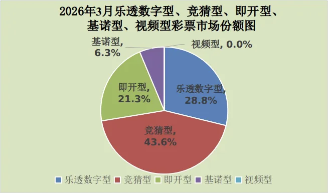 1-3月累计,乐透数字型彩票销售395.48亿元,同比减少21.09亿元,下降5.1%;竞猜型彩票销售625.14亿元,同比减少17.85亿元,下降2.8%;即开型彩票销售329.87亿元,同比减少4.95亿元,下降1.5%;基诺型彩票销售89.08亿元,同比减少2.45亿元,下降2.7%。1-3月,乐透数字型、竞猜型、即开型、基诺型彩票销售量分别占彩票销售总量的27.5%、43.4%、22.9%、6.2%。视频型彩票销售0.0150亿元,同比增加0.0113亿元。